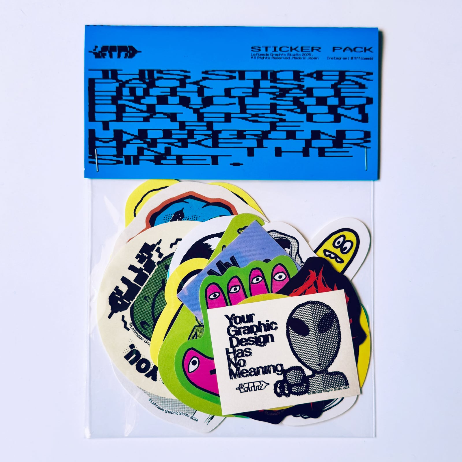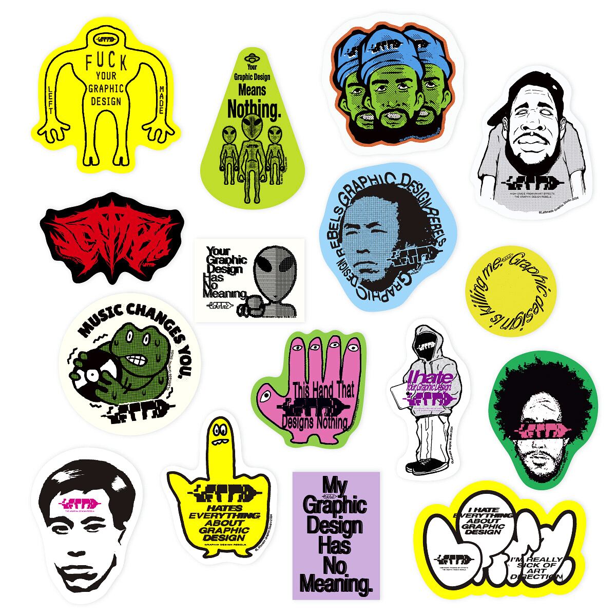 様々なグラフィックとイラストが目を引くステッカーパックです。